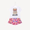 Multicolour stretch-cotton Teddy Bear motif short set from MOSCHINO KIDS featuring signature Teddy Bear motif, all-over logo print, round neck, short sleeves, drawstring fastening waist and knee-length.