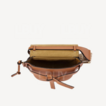 -Shoulder, crossbody, sling or belt carry -Detachable and adjustable shoulder strap -Front flap pulls in under knotted belt for secure fastening -Two internal slip pockets -Customisable with personalisation charms -Gold suede lining -Embossed Anagram