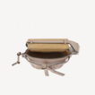 -Shoulder, crossbody, sling or belt carry -Detachable and adjustable shoulder strap -Front flap pulls in under knotted belt for secure fastening -Two internal slip pockets -Customisable with personalisation charms -Gold suede lining -Embossed Anagram