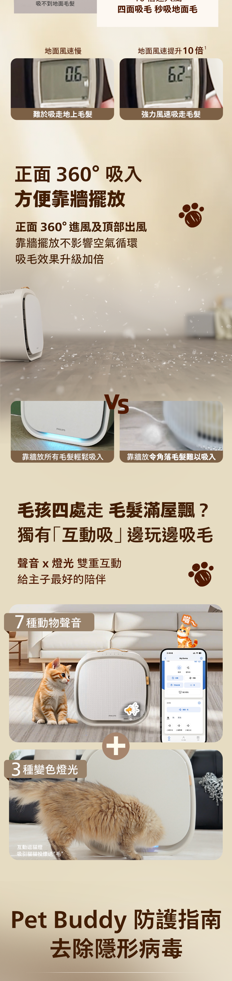 PET-FRIENDLY DESIGN: ANTI-DROP SEAT; CLAW BUTTON TO PREVENT ACCIDENTAL START; CHEWABLE CORD, ETC. Owner friendly features: Top with handle for easy carrying; compact body fits perfectly into tight spaces; 22dB sleep mode*****, ensuring you and your pet are not disturbed while resting