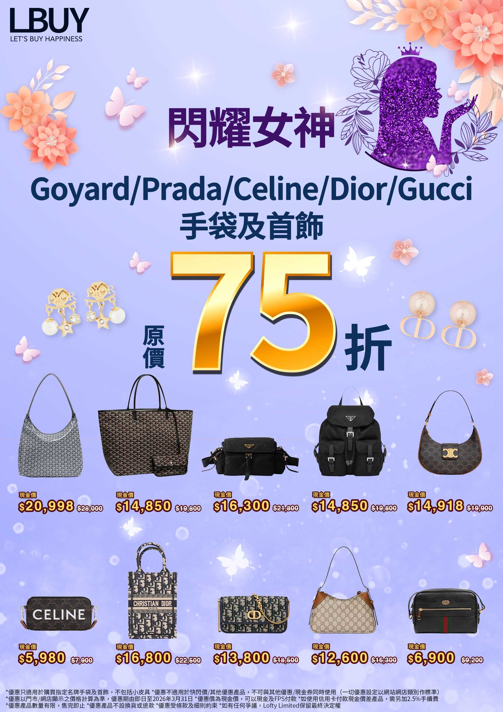 【💫閃耀女神・Goyard/Prada/Celine/Dior/Gucci 名牌手袋及首飾尊享原價75折✨】