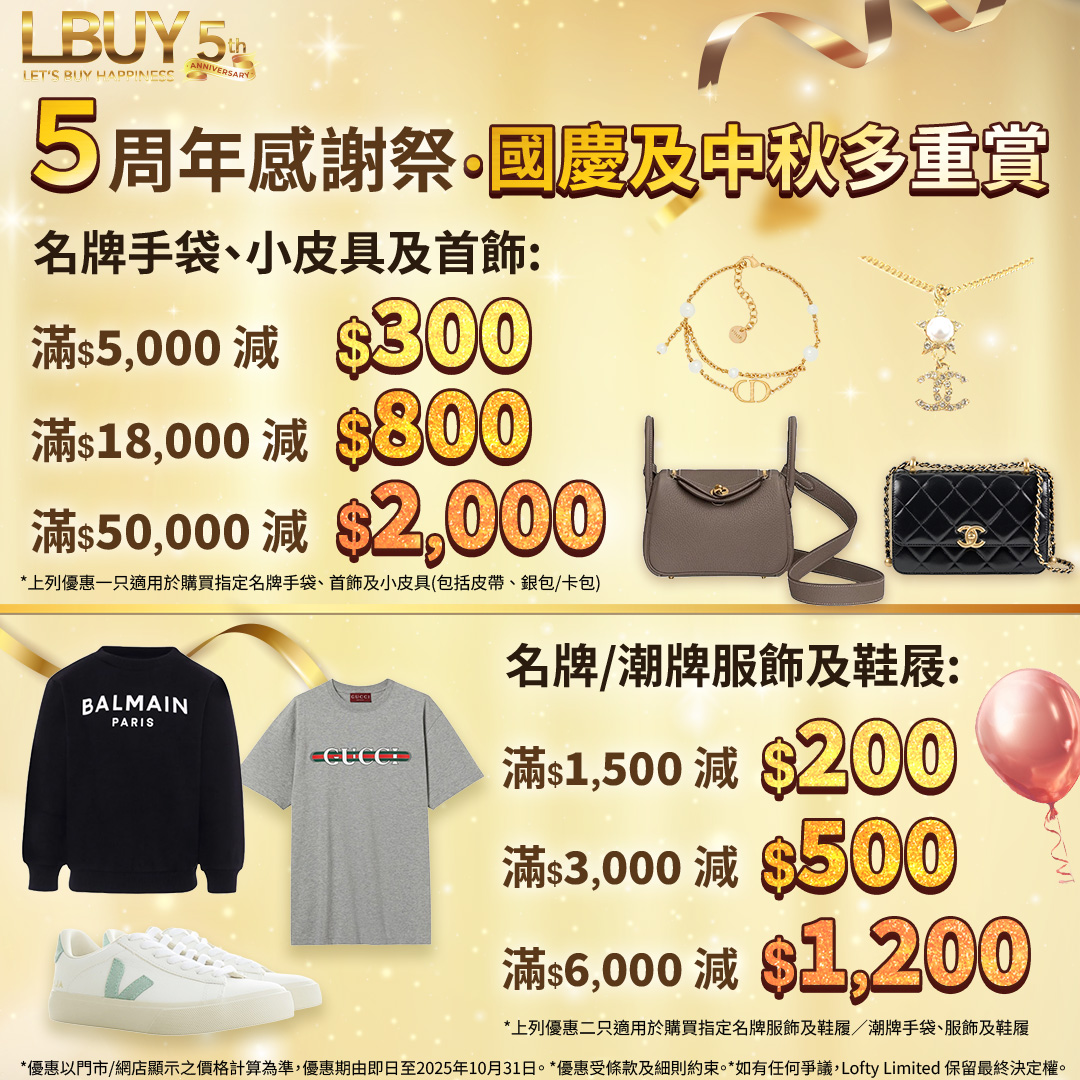 【LBuy VIP 5周年慶典・專屬禮遇 🎉】 【LBuy VIP 5周年慶典・專屬禮遇 🎉】 衷心感謝您一直以來對 LBuy 的支持與厚愛!💛 適逢 LBuy 5周年慶典及萬聖節將至,我們特別將「名牌及潮牌優惠」延長至 10月31日,為您準備一系列限時驚喜優惠,與您一同分享這份喜悅! ✨ 多款潮牌與 Chanel 新品剛剛登場,還有 Goyard、Gucci、Coach 名牌手袋👜、潮牌服飾與配飾等精選品牌限時優惠,讓您有更多 2025-10-16 15:21:18