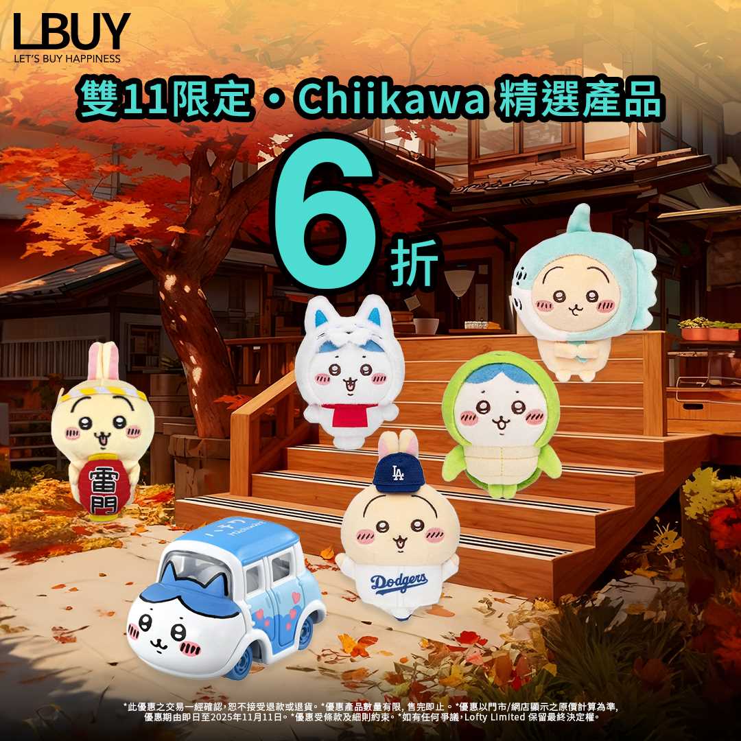 【🍁 雙11限定:Chiikawa 精選產品 6折優惠登場 🏮】 【🍁 雙11限定:Chiikawa 精選產品 6折優惠登場 🏮】 深秋午後,紅葉在微風中輕輕飄落,日式庭園裡瀰漫著柔和的笑語——吉伊、小八與兔兔正悠閒地在木階旁嬉戲,陽光灑落在樓梯上,映照出一片溫暖的秋日色彩,讓整個庭園染上柔和的橙紅韻味。🍂 Chiikawa 們輕輕擺動身體,咯咯笑著,讓這個秋日庭園故事添上一抹 Chiikawa 的溫柔可愛💛一起期待屬於他們的「開心 6 折時刻」 2025-10-24 10:00:00