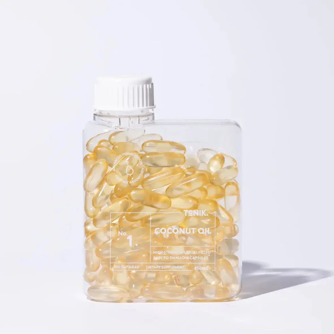 TONIK No.1 椰子油軟膠囊含有 1000毫克椰子油,每粒膠囊富含中鏈三酸甘油酯 (medium-chain triglycerides,MCT),椰子有機種植,並從椰子樹的乾堅果(果實)中提取椰子油,冷壓加工,從而保留了油的所有營養成分。這款膠囊可以幫您促進新陳代謝和維持能量水平,有益於皮膚健康、頭髮健康、細胞再生、促進消化、幫助睡眠等等,椰子油一直是保建產品的常用原料之一,不妨試試!