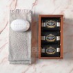 香味說明:葡萄和紅漿果的複雜香味相結合,營造出清新的果香。3 件套肥皂裝在一個優雅的木盒中,可以重複使用。