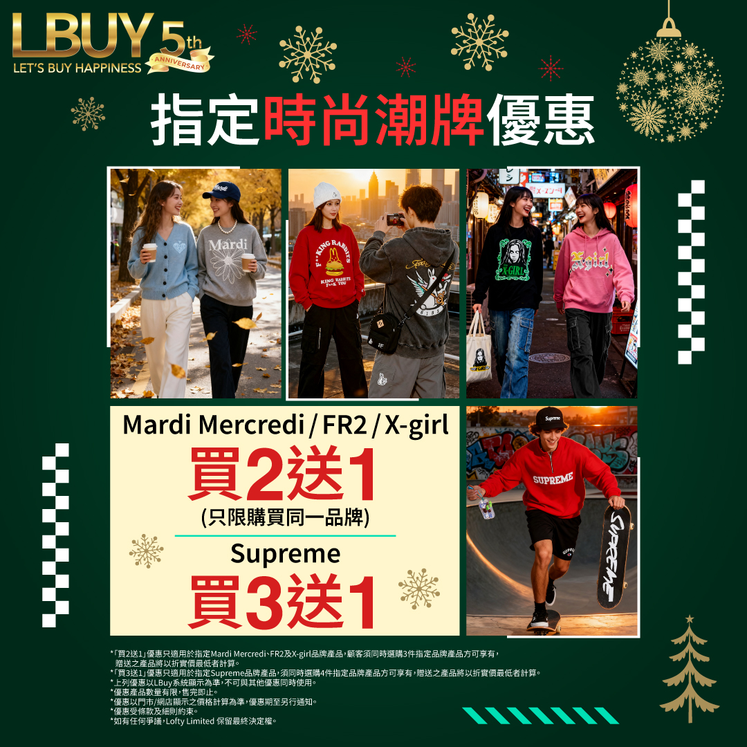 【🔥指定時尚潮牌全線產品 買滿即送優惠】 【🔥指定時尚潮牌全線產品 買滿即送優惠】 💥城市節奏越來越快,無論是行街打卡、城市夜行還是滑板公園的自由瞬間,你都值得穿上代表自己的潮流服飾。LBuy限時推出4款人氣潮牌買滿即送優惠,現在就趁機換上全新造型,展現「我就是我」的風格態度!😎 👕 指定時尚潮牌優惠 (只限購買同一品牌) ✨ Mardi Mercredi: 買2送1 ✨ FR2: 買2送1 ✨ X-girl: 買2送1 2025-12-17 10:00:00