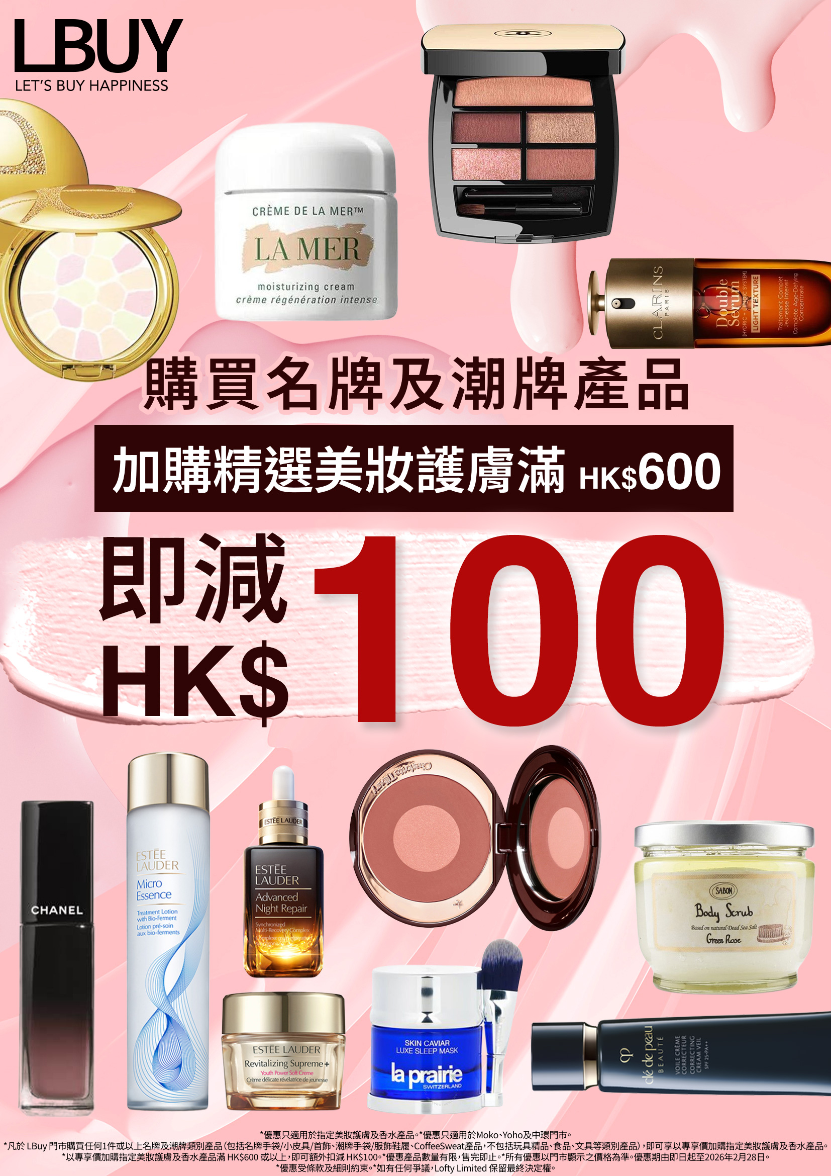 🎀迎接新年與情人節,是時候為自己來一場美麗升級!✨由即日起至2月28日,凡於 LBuy Moko、Yoho及中環門市購買任何1件或以上名牌及潮牌產品,即可享受精選美妝護膚產品滿 HK$600 減 HK$100 的限時加購優惠!🔥