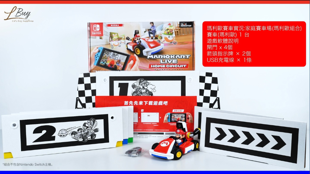盒內含有Mario賽車、遊戲軟件說明、閘門x4、USB充電線x1條以及箭頭指示牌x2個