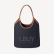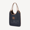 Miu Miu Ivy Denim bag reinterprets the classic silhouette in a modern design, made of iconic denim, with a delicate leather handle and a leather letter logo, showing a style that coexists between softness and fashion. Gold-colored metal trim enhances the overall texture with a denim lining and zipped inner pocket for practicality and design. Measuring approx. 40 x 35 cm, ample capacity, suitable for everyday commuting or casual looks, exuding an elegant atmosphere of nature. SKU: 5BG231_ACRR_F0S30_V_MLF
