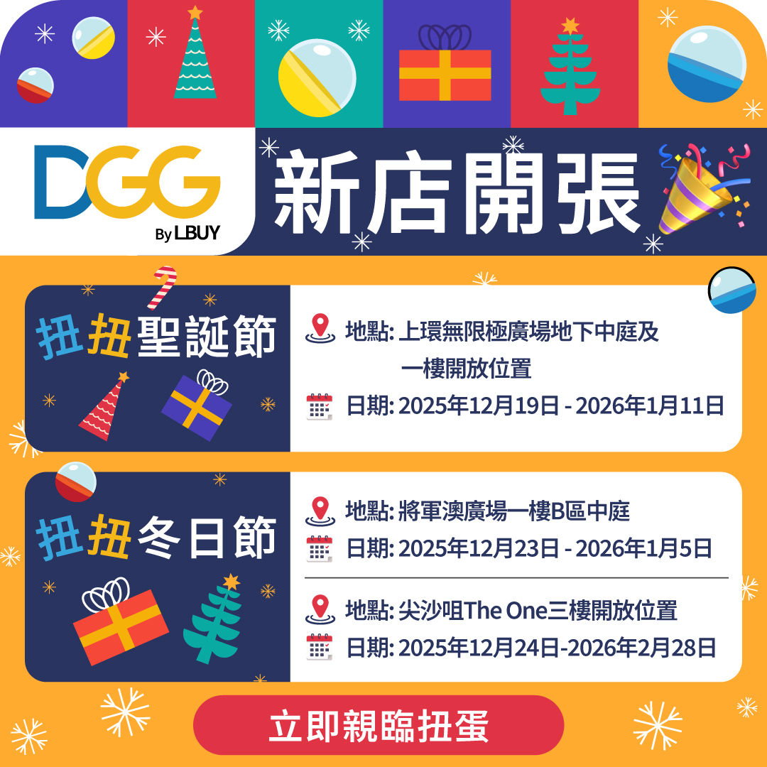 【DGG by LBuy 新店開張🎊】 【DGG by LBuy 新店開張🎊】三大DGG據點齊發亮✨,DGG by LBuy已登陸上環無限極廣場、尖沙咀 The One及將軍澳廣場,讓您無論在港島、九龍或新界,都能輕鬆享受DGG帶來前所未有的扭蛋盛宴😆! DGG扭扭聖誕節🎄📍地址:上環無限極廣場地下中庭及一樓開放位置📅日期: 2025年12月19日-2026年1月11日🕘營業時間:24小時營業🎡 DGG 扭扭冬日節📍 2025-12-23 10:00:00