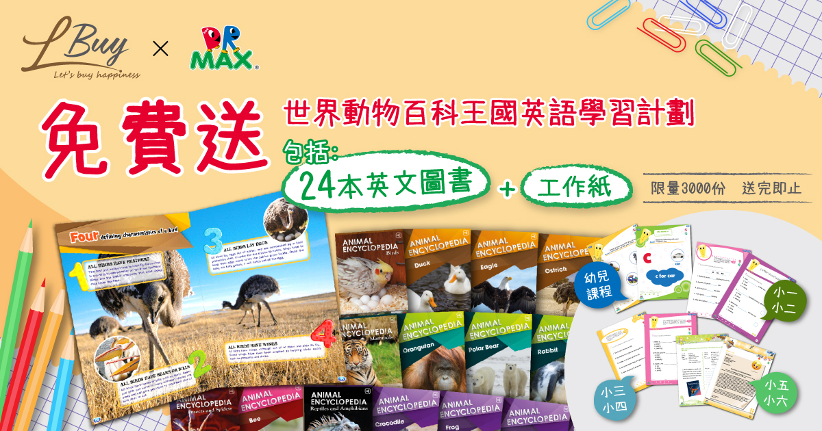由即日起至 30/11,只需在 LBuy FB 完成小任務,即可獲得「世界動物百科王國英語學習計劃 (24本) + 工作紙」!五大主題的圖書套裝教導孩子分辨各種動物和昆蟲,不但可以激發小朋友的好奇心,加強觀察力之外,還可以幫助小朋友養成閱讀好習慣!