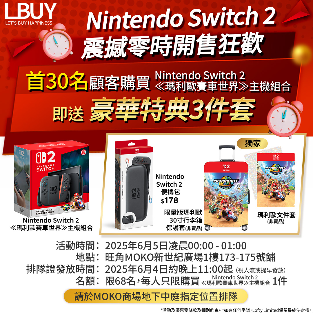 【LBuy Nintendo Switch 2 震撼零時開售狂歡🎉】任天堂粉絲絕對唔可以錯過📢📢📢!LBuy 推出Nintendo Switch 2 震撼零時開售狂歡活動,讓您於6月5日首發日第一時間率先購買NS2🔥,搶先體驗全新Nintendo Switch 2遊戲魅力! 首30名顧客現場購買Nintendo Switch 2 ≪瑪利歐賽車世界≫主機組合更可獲得豪華特典3件套 (總值 $588),隨後38名顧客可獲精美特典乙份,就讓我哋一齊迎接呢個屬於任天堂粉絲的盛大時刻🎊! 【 LBuy Nintendo Switch 2震撼零時開售狂歡】詳情✨活動時間:2025年6月5日凌晨00:00 - 01:00✨地點 : 旺角MOKO 1樓173-175號舖-LBuy 旗艦店✨名額 : 68名,每個名額僅限購買Nintendo Switch 2 ≪瑪利歐賽車世界≫主機組合一件(先到先得)✨排隊證發放時間:2025年6月4日約晚上11:00起(視人流或提早發放)仍未訂機嘅任天堂fans記住把握機會,6月5日親臨現場購買,到時見😉!LBuy為任天堂認可零售商之一,保證正版正貨👍。了解更多:https://c01.co/1d3WF📝活動條款及細則:1. 本活動僅限顧客現場購買Nintendo Switch 2 ≪瑪利歐賽車世界≫主機組合,不可領取任何預購訂單或購買其他貨品。2. 每位顧客限購每款Nintendo Switch 2 ≪瑪利歐賽車世界≫主機組合產品一件,僅限單次交易,購物後排隊證將被收回。3. 本活動出售之所有商品及贈送之特典數量有限,先到先得,售完或送完即止。4. 排隊證於2025年6月4日約晚上11:00起發放(視人流或提早發放),限68名,先到先得。5. 僅持有效排隊證正本者可購物,非持證者不可購買。6. 排隊證僅限2025年6月5日凌晨00:00至01:00有效,損毀、影印或拍照證無效,不補發。7. 顧客獲發排隊證後,須持正本繼續排隊,不能離開隊伍以免做成混亂。顧客必須依照排隊證次序購買。8. 為確保秩序,排隊期間每位參加者僅限一人計算,每人限取一個排隊證,禁止代他人排隊。如有違規,Lofty Limited有權拒絕參加者進店購物。9. 本活動於2025年6月5日凌晨00:00至01:00舉行,最後進入排隊時間為6月5日00:30。10. 如有需要,Lofty Limited將實施人流管制措施,包括但不限於派發排隊證、截止排隊或提前終止活動。11. 所有宣傳圖片僅供參考,以實物為準。12. 購買此商品將不可賺取 LDollar。13. LBuy為任天堂認可零售商之一,所售之Nintendo Switch 2 ≪瑪利歐賽車世界≫主機組合為原裝行貨;任天堂香港代理憑顧客購買之收據及機身編號提供香港本地保養和維修。產品不設任何更換,開封後任何問題都需要到香港代理跟進,敬請見諒。14. 活動詳情如有更改,恕不另行通知。Lofty Limited保留在任何情況下取消、暫停、延遲或更改本活動及其條款及細則的權利。因該等變更引致的任何損失或後果,Lofty Limited概不負責。15. 如有任何爭議,Lofty Limited保留最終決定權。16. 有關活動最新資訊請密切留意LBuy社交平台同官方網站發放之最新消息: https://lbuy.hk/zh-hant/News #LBuy #LBuyHK #LBuyMoko #LBuyLohas #LBuyYoho #LBuyTOP #LBuy精品主題店 #LBuy數碼扭蛋專門店 #DGGLBuy數碼扭蛋站 #2025正版正貨商標 #任天堂 #NintendoSwitch2 #Nintendo #NintendoSwitch2開賣活動