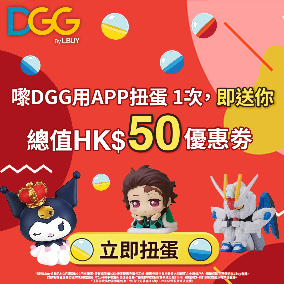 *所有LBuy會員凡於2月親臨DGG門市扭蛋,即獲總值HK$50扭蛋優惠券禮包乙份,優惠券禮包會自動發送到顧客之會員帳戶內,請確保閣下已登記為LBuy會員,如顧客在優惠券發送前未完成註冊,本公司不會重新發送優惠券