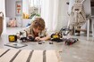 挖掘機玩具搭載可打開的車門與豐富特色。看它以履帶 360 度旋轉,然後用氣動泵升降鏟斗。小小工地迷可想像自己在現代工地施工,用鏟斗與鏈條抬起與降下充電站,準備好將充電站連接到挖掘機玩具上。