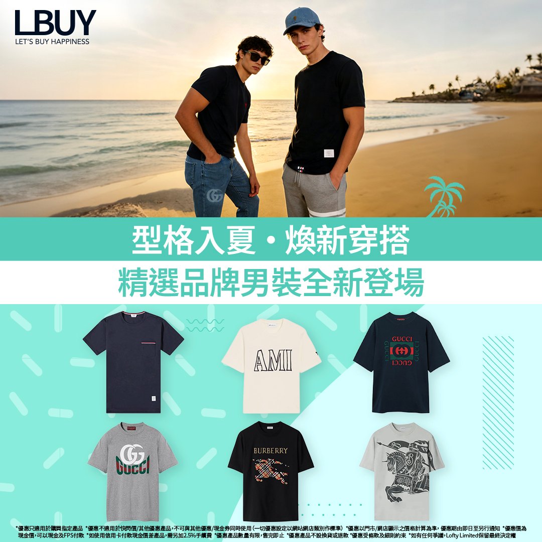 【☀️型格入夏・煥新穿搭|精選品牌男裝全新登場】 【☀️型格入夏・煥新穿搭|精選品牌男裝全新登場】 夏天,就要穿得簡單有型。LBuy 精選各大品牌男裝新款,以俐落剪裁、輕薄物料與百搭設計,輕鬆打造自在的夏日造型🌴。一件合身 T‑shirt,配搭型格太陽眼鏡🕶️及百搭帽款🧢,即時提升整體層次,輕鬆打造夏日型男 Look。 無論是日常外出、假日出遊,抑或海邊漫步,一套舒適又有態度的穿搭,加上細節配件點綴,已足以展現個人風格。從經典品牌到 2026-04-10 12:00:00