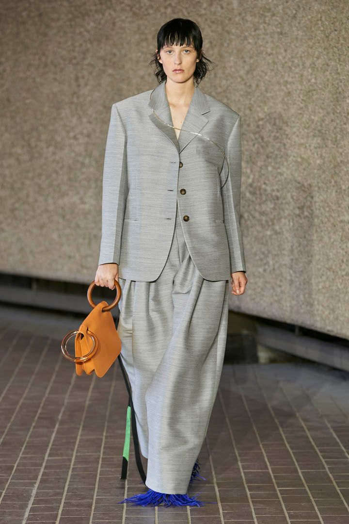 最佳配搭必然是其互補色——灰色。灰色本來已是大眾喜愛的顏色之一,衣櫥中總有件灰色大衣,配上一點蜜桃色,輕易搭出高級感!Roksanda以柔和蜜桃色手袋搭配灰色套裝,為沉穩穿搭加添一點溫柔活力,不落俗套之餘更具有獨特時尚品味。