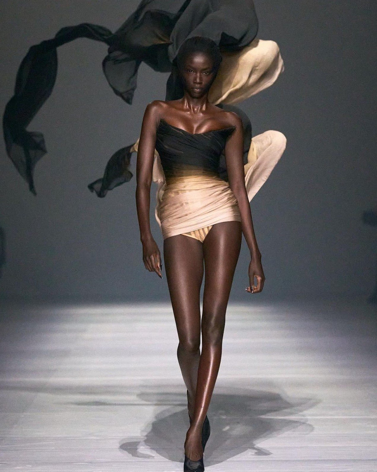 MUGLER更加出色運用材質的特性,溫柔復古的絲綢緞面,將黑色與蜜桃色完美結合,完全沒有上重下輕的感覺,反而令嚴肅的黑色變得輕柔飄逸,仙氣飄飄!