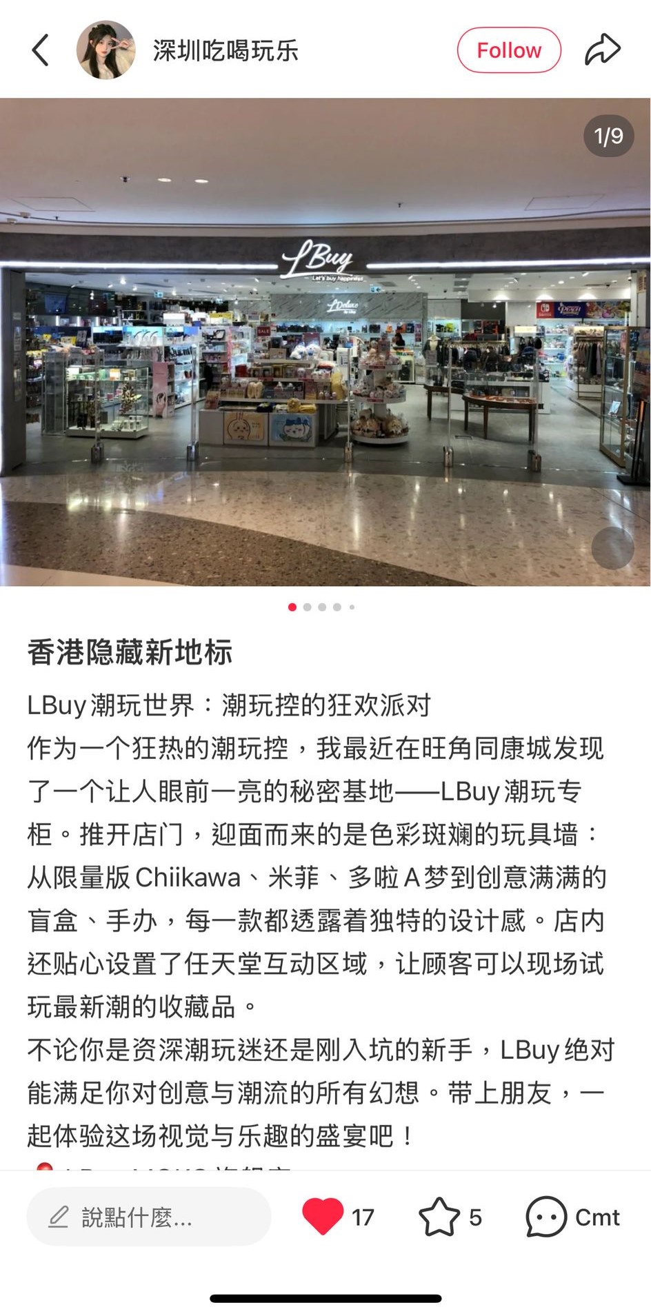 LBuy成為了一眾小紅書KOL必到嘅熱點之一💫,感謝各位KOL以充滿創意嘅方式,將喺LBuy嘅購物旅程分享到社交平台📱,不僅展現咗愉快嘅購物體驗,仲介紹好多朋友親臨門市,探索我哋嘅精品玩具、潮流商品同限定優惠✨。