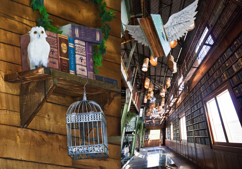 整個魔法工廠的建造保留了糖廠原有的建築,在魔幻氛圍中增添工業風,整條長廊的左邊仍能看到歷史遺留的點滴,而右邊的魔法書牆則擺放了數以百計的古舊書籍,連同懸掛於半空中長有翅膀的魔法書籍,一直延伸到長廊的盡頭。