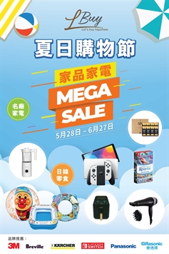 由5月28日即日至6月27日,LBUY將於將軍澳廣場舉行「夏季購物節」,大量精選家電家品,以Mega Sale價發售。
