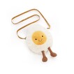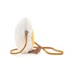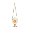 呢款可愛嘅煮蛋包包設計有芥末黃色肩帶(長度約117厘米),柔軟嘅白色絨毛,仲配有一個靚靚嘅太陽蛋黃,佢仲會隨住你行動一齊晃動佢嘅繩子靴,真係趣味十足!