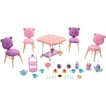 下午茶玩具套裝包括一個餐具櫃,當展開時,它會變成一張可供四個 My First Barbie™ 娃娃坐下的椅子桌。該套裝還包括美味的茶點和兩個毛絨配件。